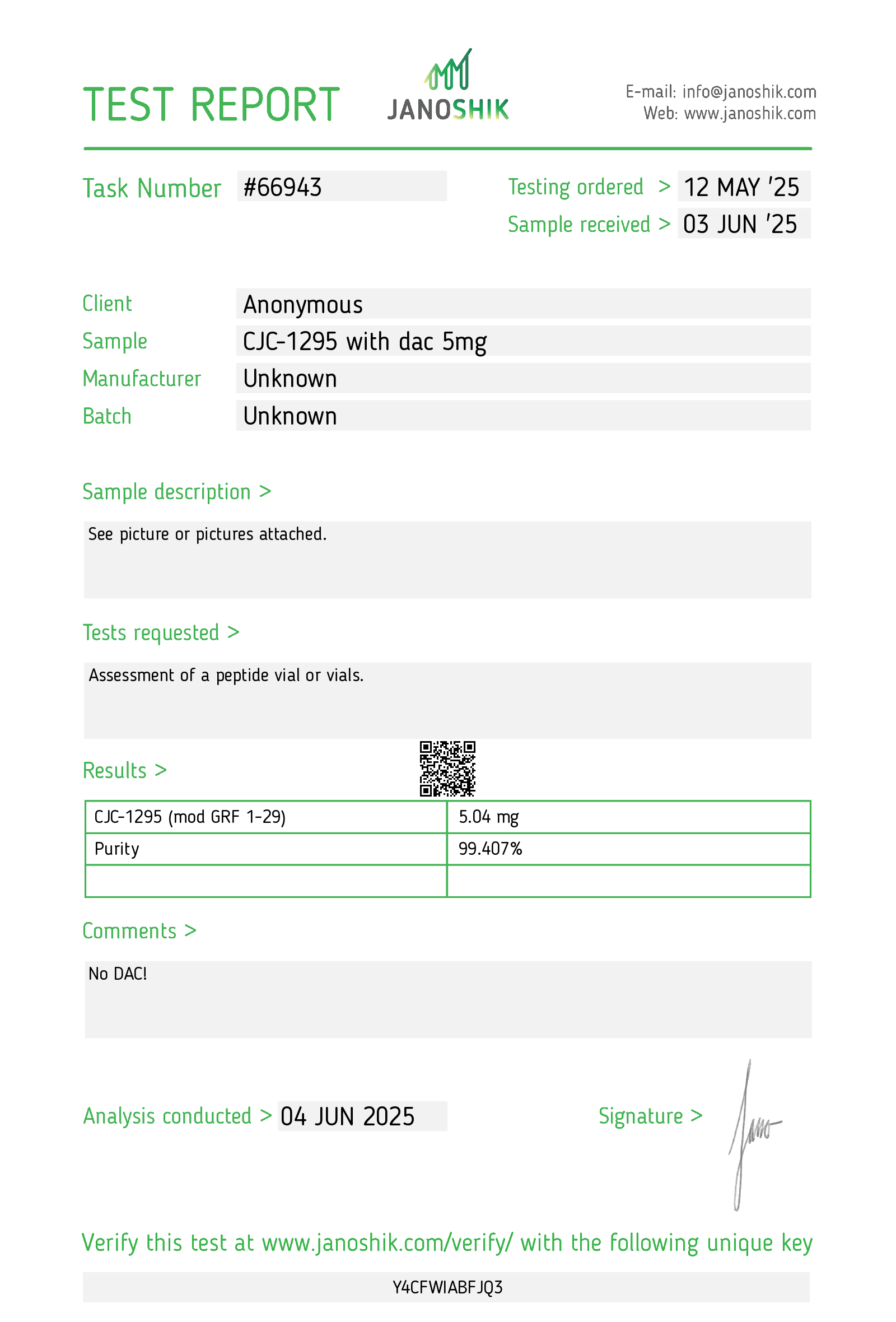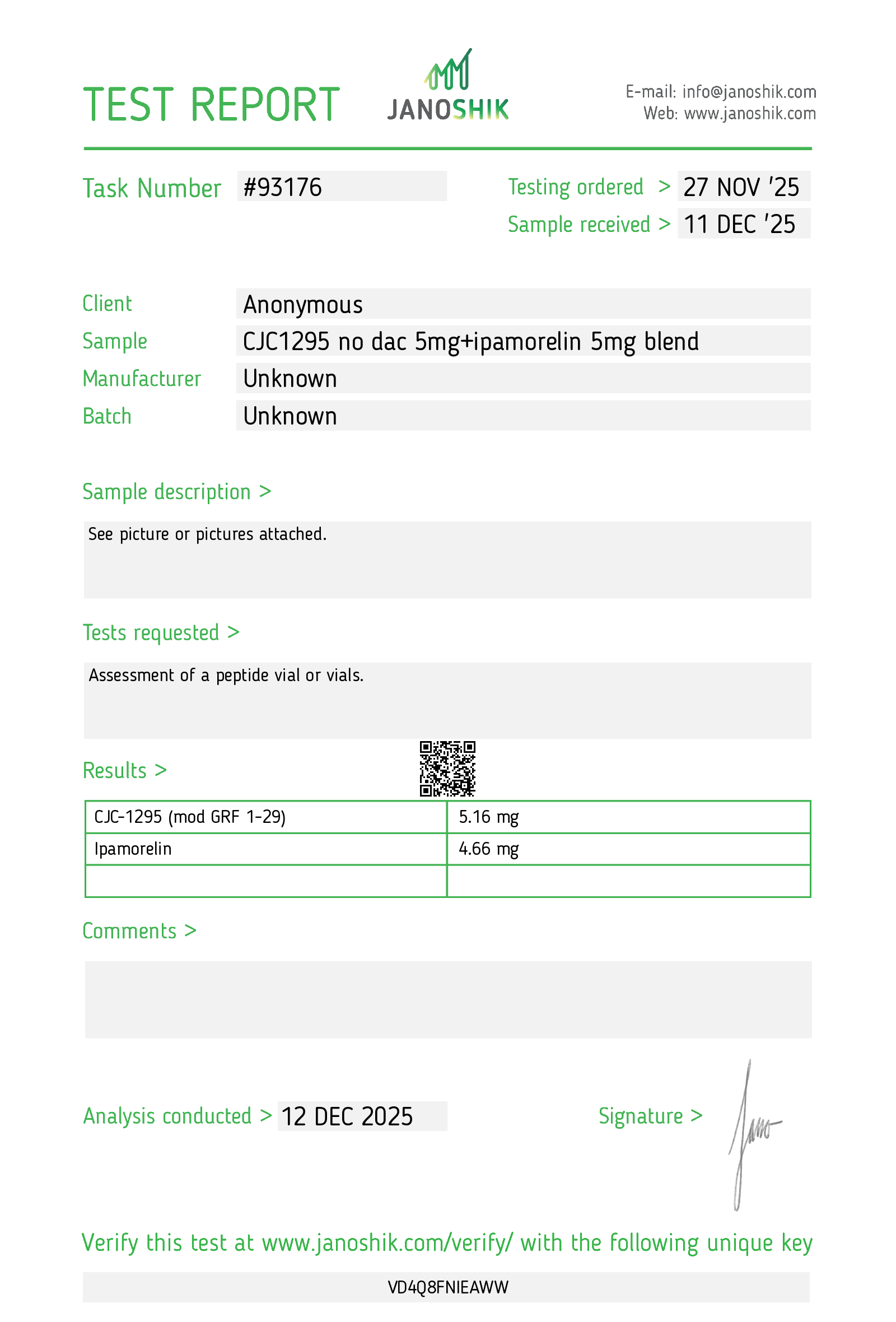 Verify at janoshik.com/verify/ with key on report.